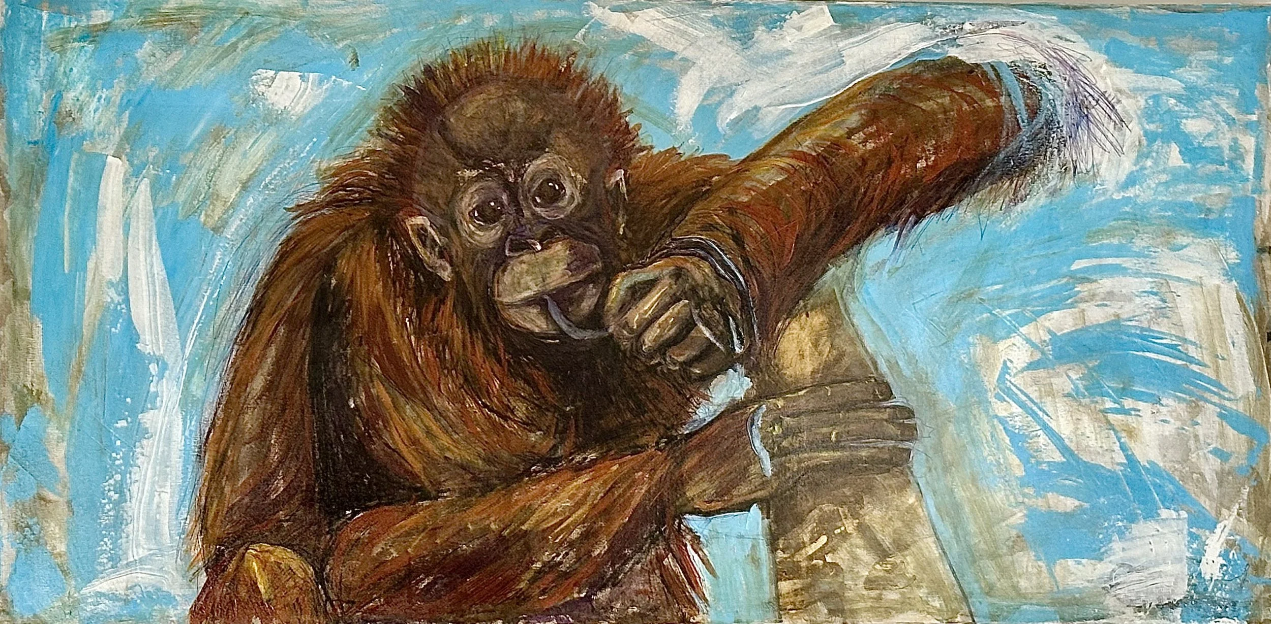 Introducing "Harry," a captivating painting that showcases an adorable orangutan with rich red-brown hair, beautifully set against a soft light blue background. This exquisite artwork is more than just a visual delight; it invites you to experience the warmth and charm of its subject, as if you could almost cuddle him.